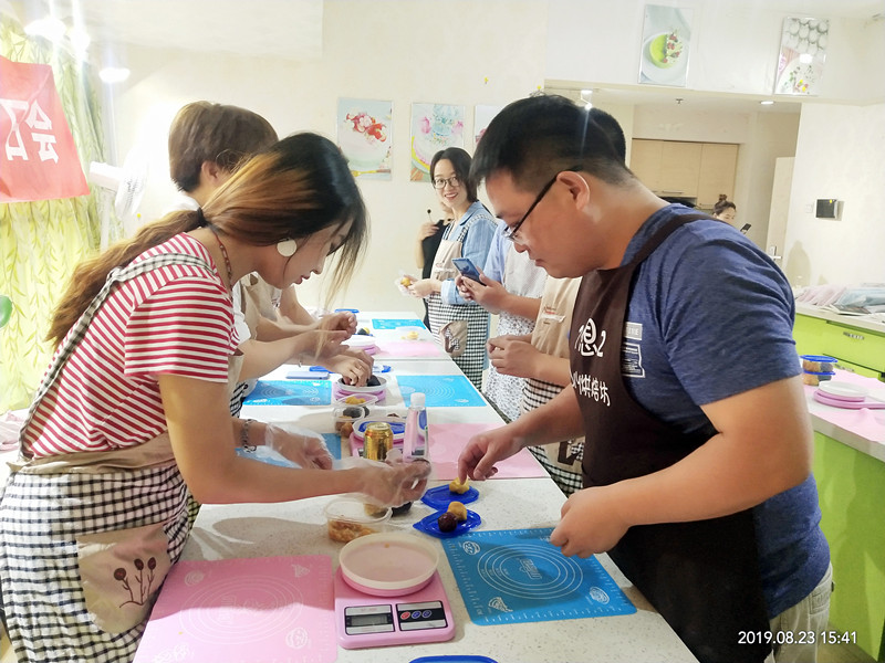 隨后,烘焙活動拉開了序幕,因時近中秋,所以此次人力資源中心選擇的是月餅DIY烘焙活動。在專業(yè)烘焙老師的講解下,每位同事都認真地聽,只見大家將事先準備好的餡料也搓成圓形,將面團搓圓,然后將一塊面皮摁扁,中心放上餡,把餅皮慢慢往上推,包裹住餡料,團成球形,在圓球上拍一點面粉,放在月餅模上,再起模,漂亮的月餅成品就出來。